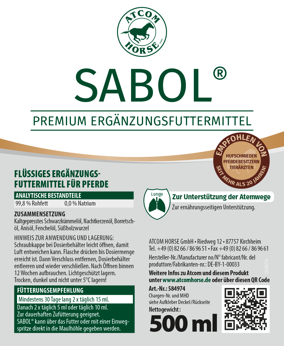 De luchtwegen van paarden worden tegenwoordig soms zwaar belast. Ruwvoer van slechte kwaliteit, blootstelling aan schadelijke gassen, hoge veedichtheid op wedstrijden of in stallen en stoffige paddocks en maneges kunnen het bronchiale systeem van het paard belasten. We hebben ATCOM SABOL ontwikkeld om de fysiologische longfunctie effectief te ondersteunen.