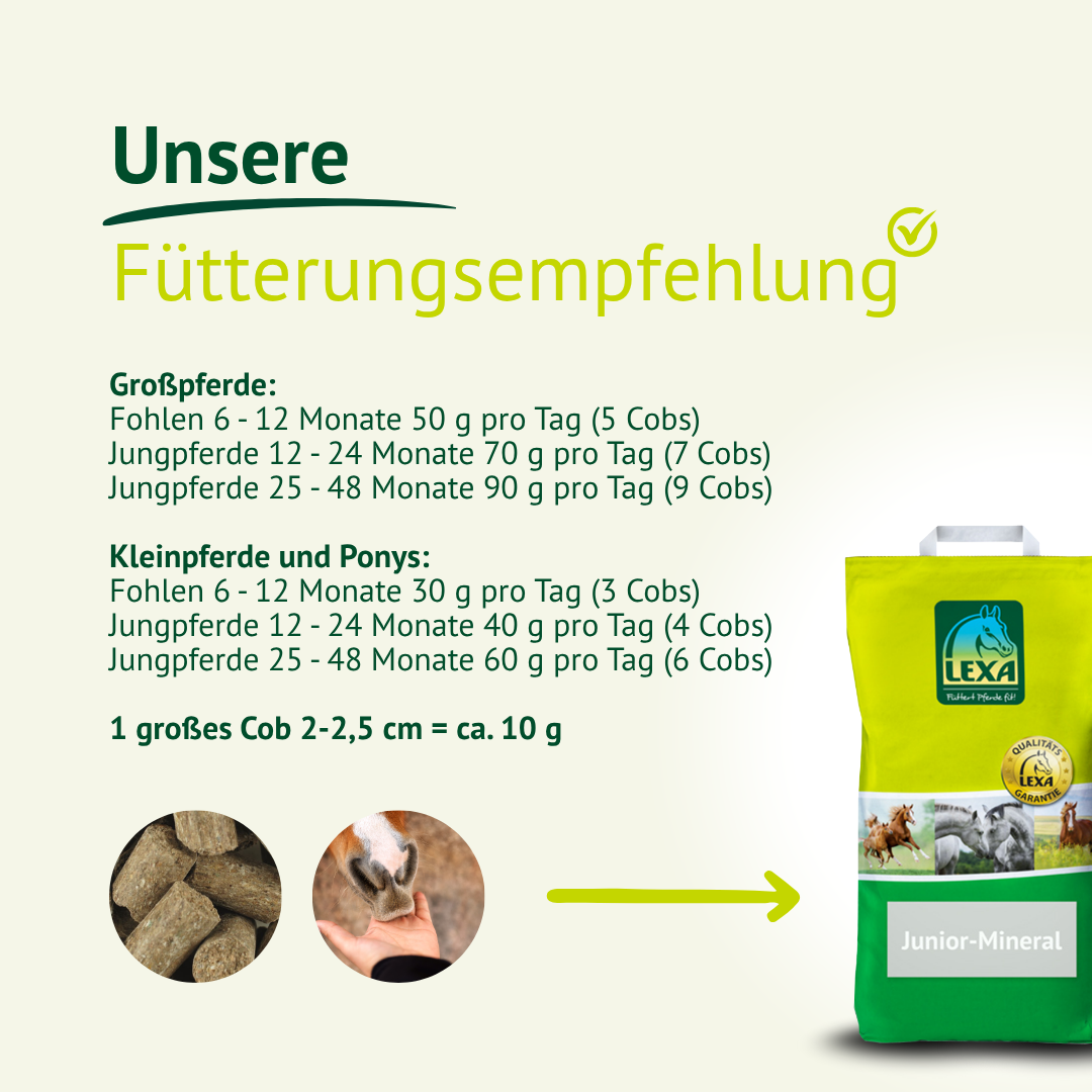 Die Junior-Mineral-Cobs versorgen Fohlen und Jungpferde gezielt mit einer sehr hochwertigen Kombination von lebensnotwendigen Mineralien, Vitaminen und Spurenelementen, die der Körper nicht selbst herstellen kann und somit über die Fütterung zugeführt werden müssen. Zusätzlich enthalten die Junior-Mineral-Cobs die essentiellen Aminosäuren Lysin und Methionin, um den Mehrbedarf des wachsenden Pferdes an hochwertigem Eiweiß zu decken. Denn Aminosäuren sind als Eiweißbestandteile wichtige Baustoffe und für den Aufbau von Körpersubstanz unerlässlich. Neben einem ausgeglichenen Ca:P-Verhältnis ist eine gut verfügbare Versorgung mit Calcium von großer Bedeutung, denn ernährungsbedingter Calciummangel kann zu Problemen der Gliedmaßen führen. Um diese hohen Ansprüche an die Fütterung zu erfüllen, sind die Junior-Mineral-Cobs mit stoffwechselaktiven Algenkalk angereichert. Algenkalk kann zusätzlich durch seinen natürlichen Vitalstoffanteil die gesamte Vitalität positiv beeinflussen. Des Weiteren sind für eine optimale Entwicklung eine bedarfsgerechte Versorgung an Spurenelementen wie Selen, Kupfer, Mangan und Zink wichtig. In diesem Bereich liefern die Junior-Mineral-Cobs durch zugesetzte organisch gebundene Spurenelementen eine hohe biologische Verfügbarkeit. Kieselgur, Bierhefe, Seealgen und Leinöl runden die anspruchsvolle Rezeptur ab und können die Versorgung von Haut und Haar optimieren und sorgen für ein glänzendes Fell.