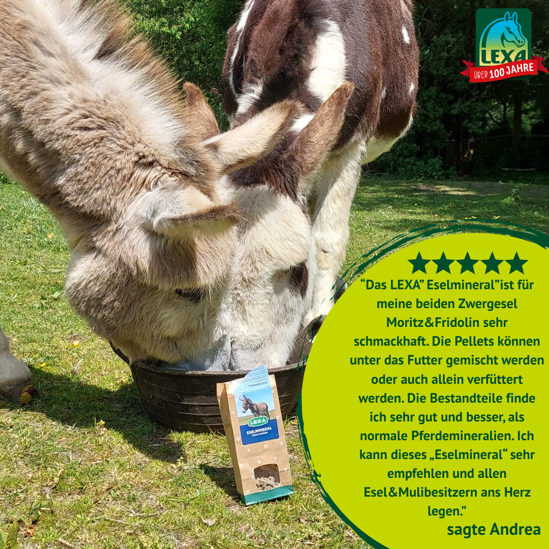 Das LEXA „Eselmineral“ ist für meine beiden Zwergesel Moritz&Fridolin sehr schmackhaft. Die Pellets können unter das Futter gemischt werden oder auch allein verfüttert werden. Die Bestandteile finde ich sehr gut und besser, als normale Pferdemineralien. Ich kann dieses „Eselmineral“ sehr empfehlen und allen Esel&Mulibesitzern ans Herz legen.
