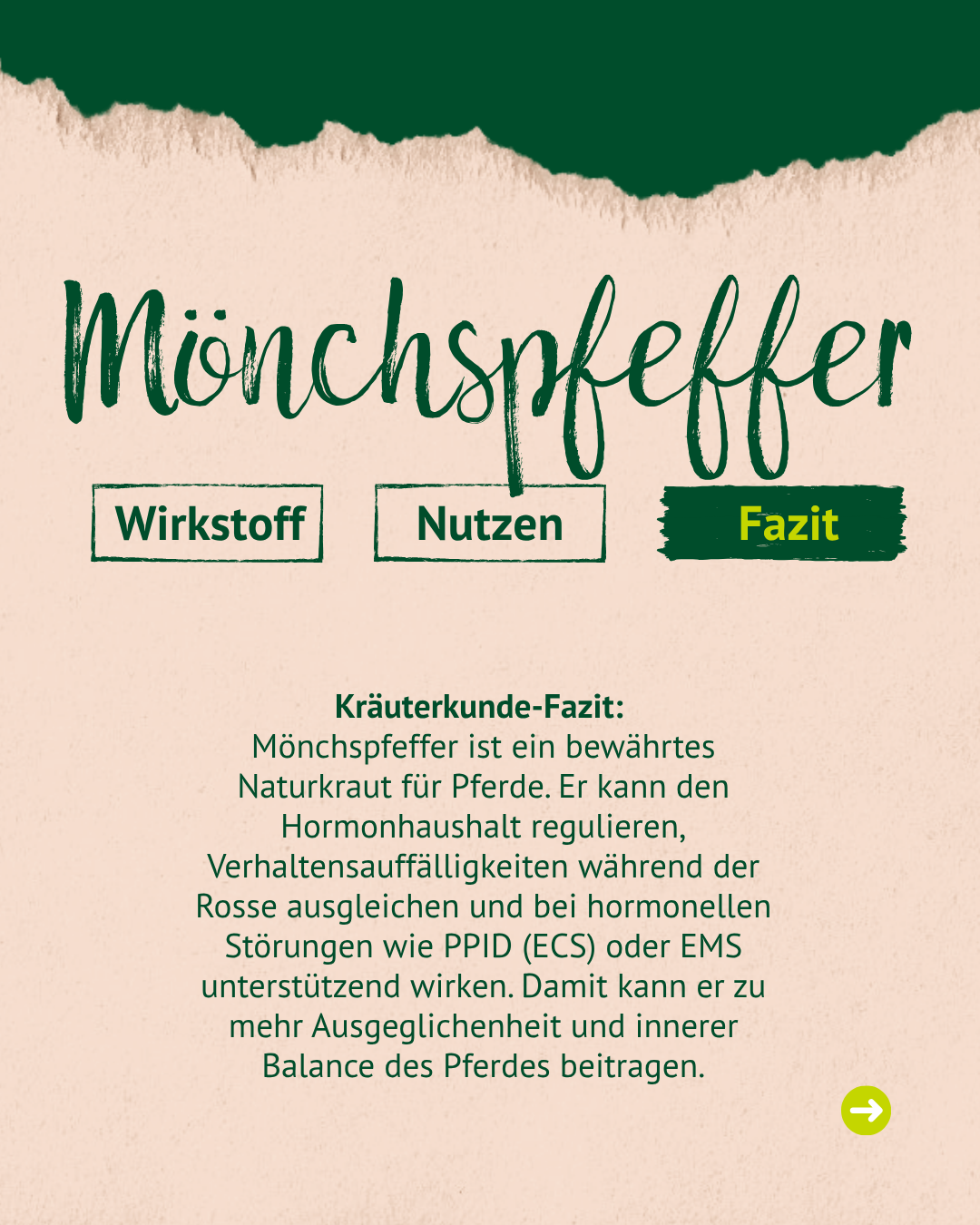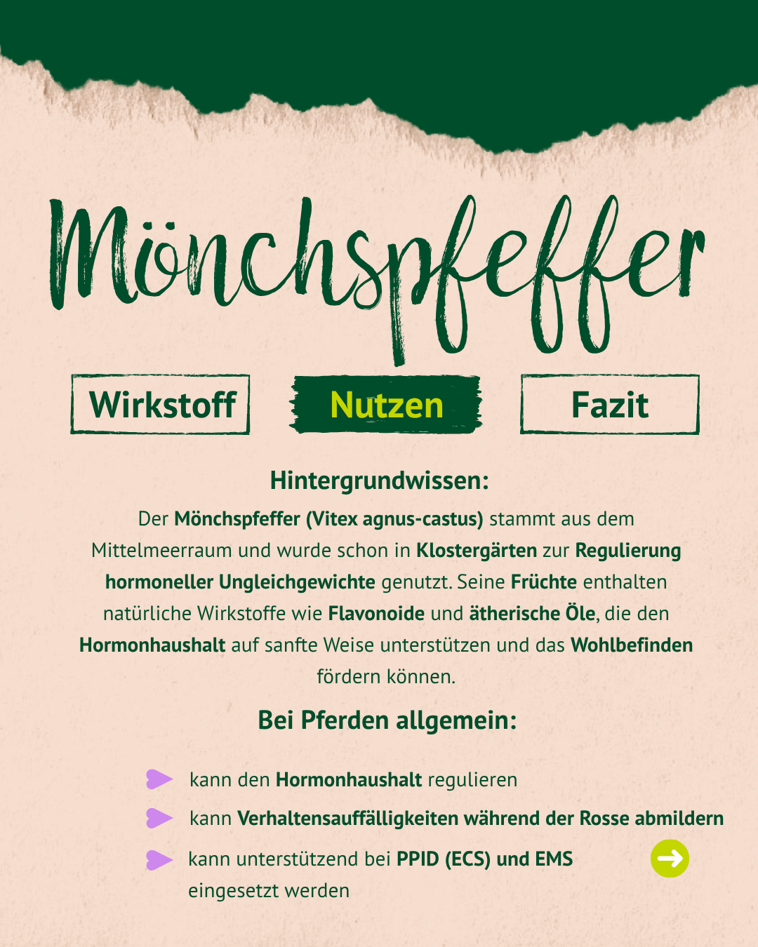 LEXA Monnikspeper kan een matigend effect hebben op de hormoonhuishouding van merries, hengsten en ruinen en kan zo de geslachtsdrift verminderen. Monnikspeper kan een cyclusregulerende werking hebben, vooral bij merries met gedragsveranderingen tijdens de loopsheid. Maar monnikspeper kan ook de hormoonspiegels in balans brengen bij paarden die lijden aan het Equine Cushing's Syndrome (ECS) en kan zelfs sommige symptomen bij EMS-paarden verlichten.