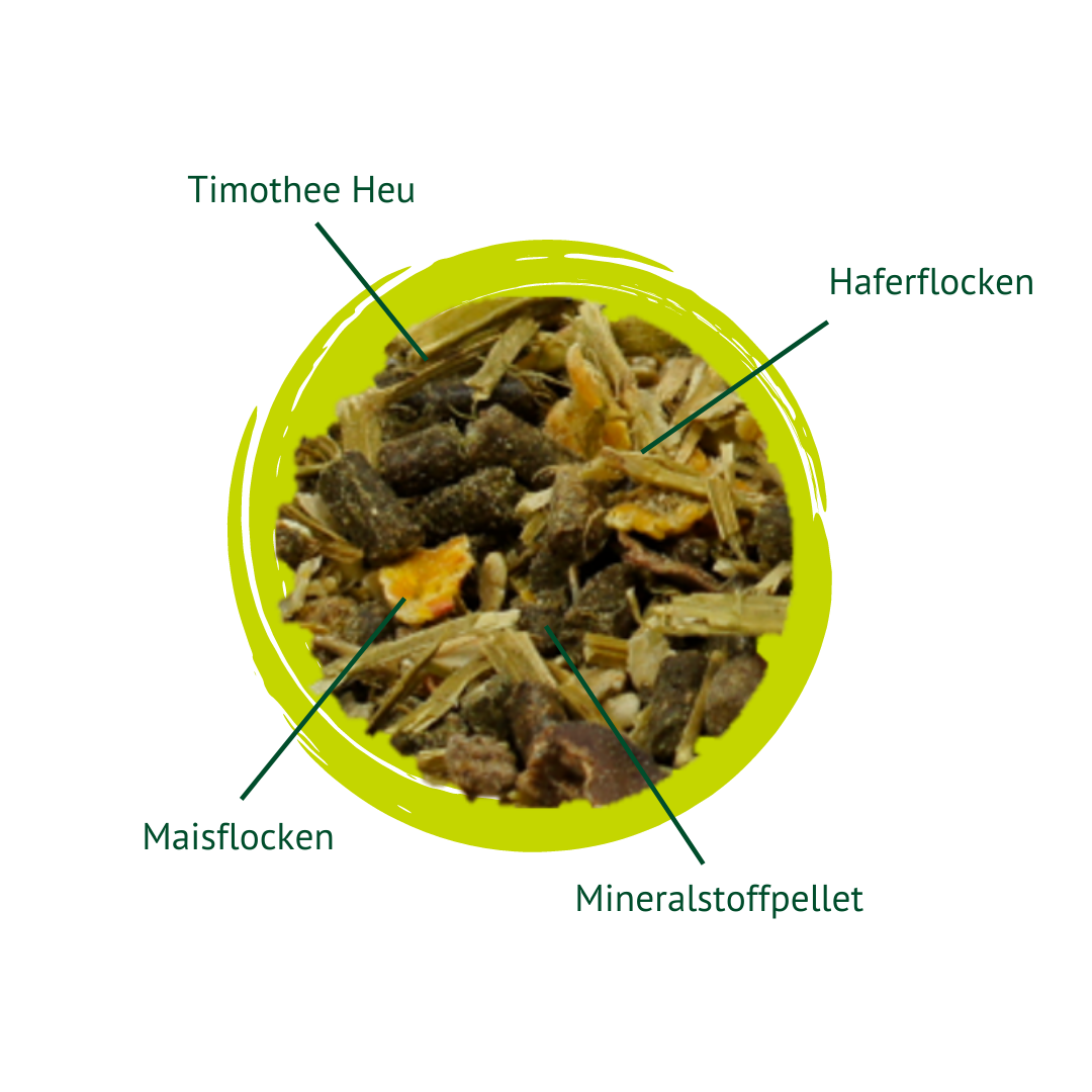 Luzernemeel, fijn lijnzaadschilfers, maïskiemen, havervlokken, maïsvlokken (hydrothermisch verteerd en gerold), timothee hooi, biergist, sojaschroot, lijnzaad, bierbostel, suikerbietmelasse, tarwegrieszemelen, johannesbroodschroot, maïs, natriumchloride, raapzaadolie, koolzure algenkalk, lijnzaadolie, wortelblokjes, monocalciumfosfaat, magnesiumoxide. |